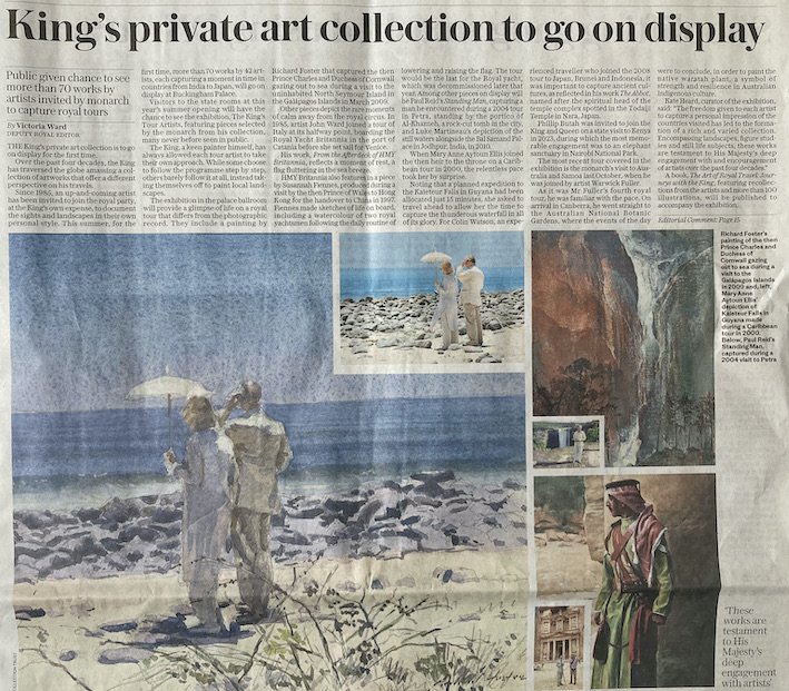 In March 2009 he accompanied HRH The Prince of Wales on his Official Tour of South America as tour artist. In the exhibition at Buckingham Palace, summer 2025, of a selection of pictures done by all the artists on the tours, Richard’s watercolour of the then Prince of Wales and Duchess of Cornwall took pride of place.